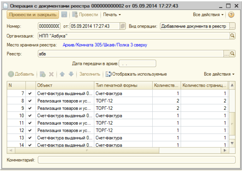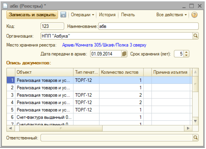 Если заполнить поле ввода «Дата передачи в архив», а затем «Срок хранения», то в этом же документе будет выполнена операция «Передача реестра в архив». Табличная часть заполняется документами, оригиналы которых будут храниться в этом реестре.
